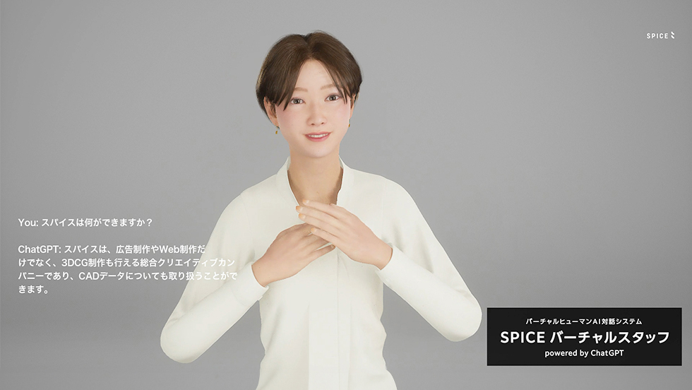 「SPICEバーチャルスタッフ」は、株式会社スパイスが提供する対話型AI搭載※のバーチャルヒューマンです。人間の体や動きをデジタル化し記録するモーションキャプチャーシステムや、3DCG制作の技術などをフルに活用し、美しく実写に近いアバター作成を実現。「SPICEバーチャルスタッフAIタイプ」と「SPICEバーチャルスタッフTOUCH」、選べる2タイプのうち、AIタイプではChatGPTによる自動返答や企業独自の質問への対応、肉声をベースにした合成音声もご利用可能です。