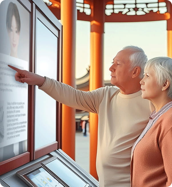 タッチパネルによる質疑応答と音声読み上げで回答いたします。施設案内など、シンプルな対応が求められるシーンに適しています。